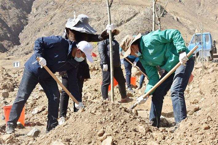 3月27日,區(qū)市142家單位的干部職工共同參加義務植樹活動,為拉薩大地再添新綠。圖為植樹現(xiàn)場,大家揮鍬鏟土、提桶澆水、搬運樹苗,栽下了一棵棵樹苗。拉薩融媒記者 旦 達攝
