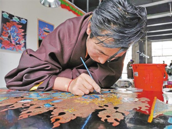圖為唐卡漆畫技藝培訓(xùn)班學(xué)員正在繪制唐卡。 鄭曉強(qiáng)、周婷婷 攝