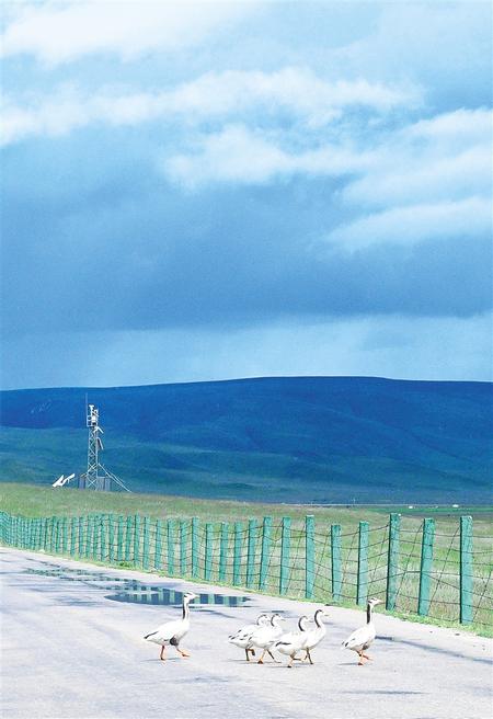 尕海湖畔,大豆雁領(lǐng)著小豆雁悠閑地穿過馬路。