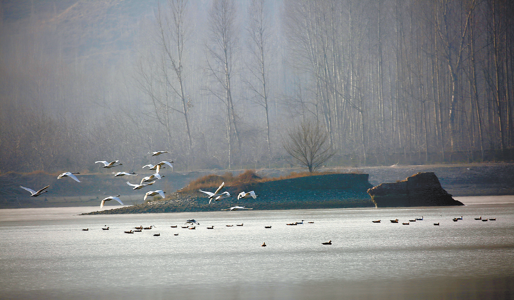 白天鵝學(xué)名叫大天鵝,屬國(guó)家二級(jí)保護(hù)動(dòng)物,它們每年11月離開(kāi)繁殖地遷往溫潤(rùn)的南方過(guò)冬,遷徙時(shí)常成6-20多只的小群或族群遷徙,過(guò)去幾乎罕見(jiàn)在我們青海的黃河等水域棲息過(guò)冬。近年來(lái),隨著三江源黃河水系生態(tài)環(huán)境的不斷改善,以往不曾見(jiàn)過(guò)的珍禽水鳥(niǎo)頻頻光顧黃河等水域安家落戶,這些水鳥(niǎo)中有白鷺、綠頭鴨、赤嘴潛鴨、白骨頂?shù)日淝?,多達(dá)10余種,而白天鵝很少來(lái)“做客”棲息。