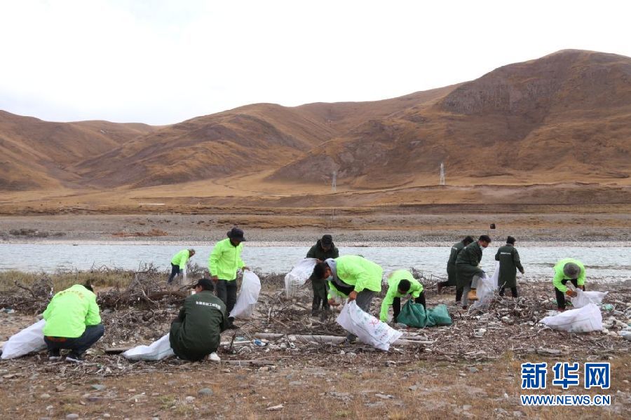 三江源國家公園治多生態(tài)環(huán)保協(xié)會的志愿者在清理河道內的垃圾(7月11日攝)。新華社發(fā)