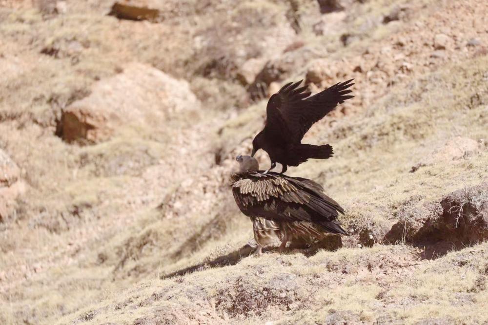 弱小的烏鴉向猛禽禿鷲發(fā)起襲擊。曲麻萊縣生態(tài)環(huán)境和自然資源管理局供圖。