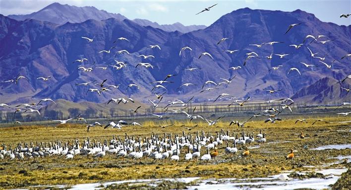 在冬日暖陽的照耀下,成群結(jié)隊(duì)的鳥兒在河面上、濕地里盡情嬉戲,赤麻鴨悠然戲水、斑頭雁低聲吟唱、黑頸鶴翩翩起舞……一派熱鬧的景象。