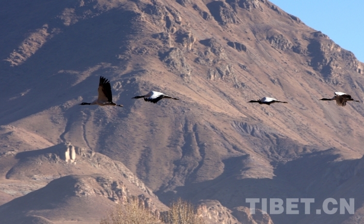 圖為黑頸鶴在林周縣境內(nèi)飛翔 攝影:王媛媛