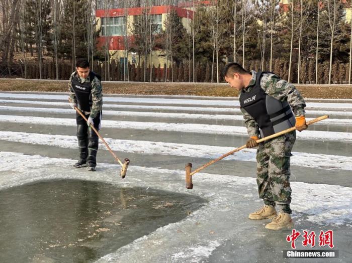資料圖為2020年12月28日,青海湖裸鯉救護中心工作人員在室外漁場破冰觀察裸鯉活動情況。 中新社記者 李江寧 攝