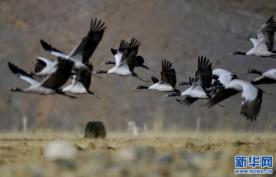 黑頸鶴在自然保護區(qū)里飛翔(2021年1月3日攝)。新華社記者 張汝鋒 攝