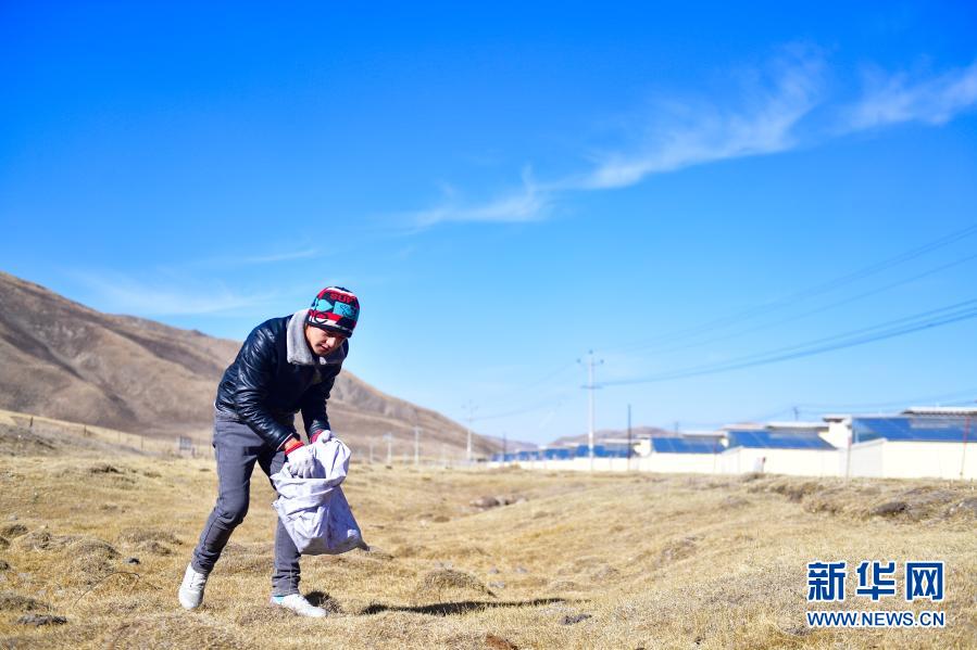 1月11日,隆亞村牧民東保在搬遷點周邊的草原上撿拾垃圾。新華社記者 張龍 攝