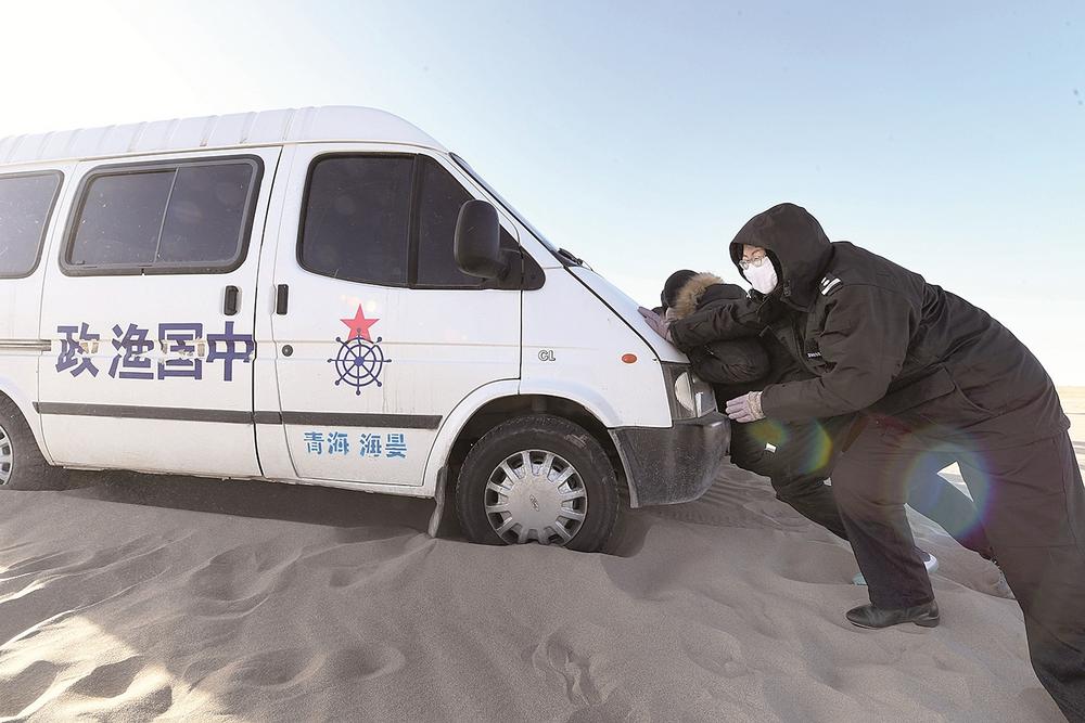 車緩緩駛向青海湖深處,即使穿得這么厚實(shí),但寒風(fēng)襲來時(shí),巡湖隊(duì)員們依舊被凍得直哆嗦。