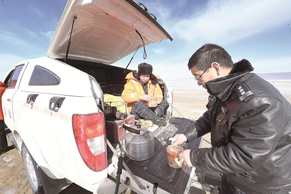 同事們前去巡查后不久,她們也開始忙碌起來,為隊(duì)員們準(zhǔn)備“豐盛的午餐”——泡面。平常再簡單不過的燒開水,在寒風(fēng)凜冽的青海湖邊卻異常艱難。