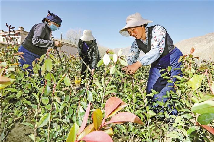 圖為拉薩市曲水縣才納鄉(xiāng)納木村村民正在房前屋后種植樹苗。