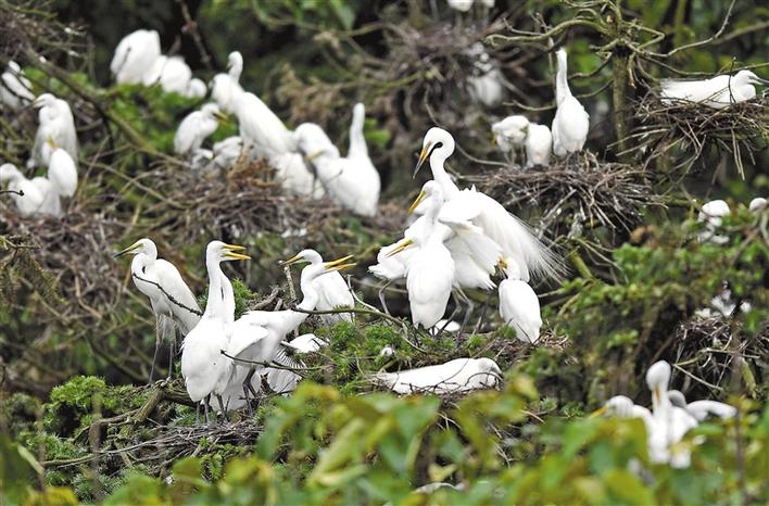 近期,在位于鄱陽湖畔的江西省南昌市新建區(qū)象山森林公園內,已安家筑巢的鷺鳥進入孵化哺育旺季。象山森林公園有著“鷺鳥王國”的美譽,每年都會吸引白鷺、蒼鷺、夜鷺等種類的鷺鳥飛抵棲息和繁衍后代。 白鷺在南昌市新建區(qū)象山森林公園內棲息(5月18日攝)。新華社記者 萬象 攝