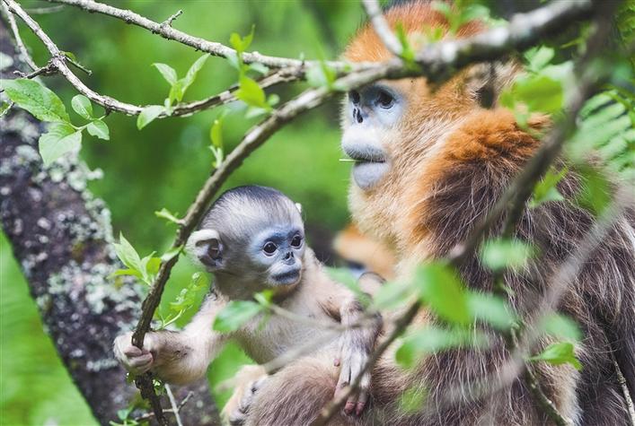 神農(nóng)架國家公園動物保護人員經(jīng)過多年的努力,加之當?shù)厣鷳B(tài)環(huán)境的不斷改善,神農(nóng)架金絲猴由上世紀80年代的501只擴大到現(xiàn)在的3個金絲猴大種群9個小種群,總數(shù)達到1471只。 這是5月19日在神農(nóng)架國家公園大龍?zhí)督鸾z猴野外研究基地山林中拍攝的金絲猴。 新華社記者 肖藝九 攝
