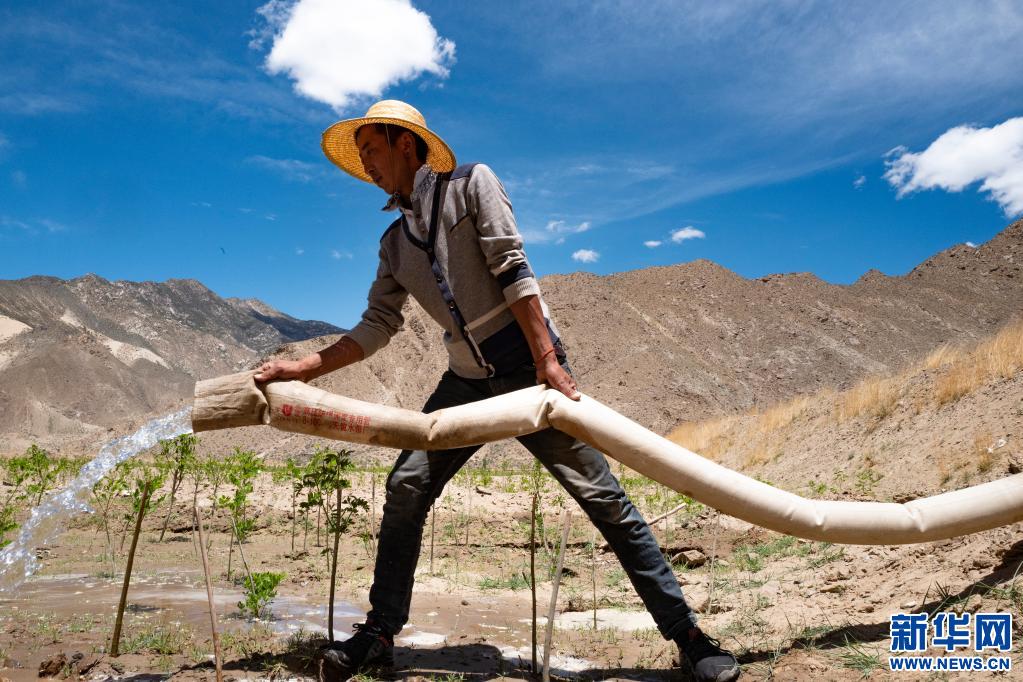 山南市貢嘎縣吉雄鎮(zhèn)劉瓊村村民正在為樹(shù)苗澆水(6月2日攝)。新華社記者 普布扎西 攝