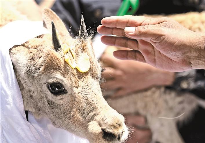 圖為7月7日,在可可西里索南達杰保護站野生動物救助中心,可可西里巡山隊員按照風俗,在藏羚羊額頭上涂抹酥油表達祝福。新華社記者 張龍 攝