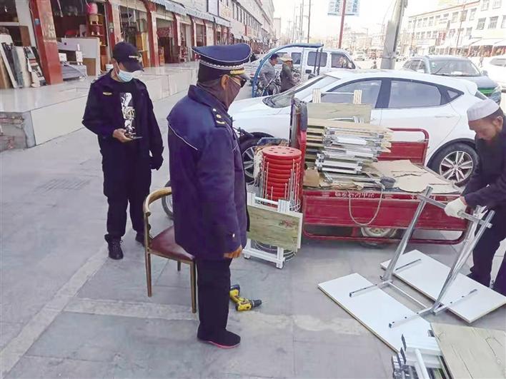 執(zhí)法人員對(duì)占道經(jīng)營(yíng)商戶進(jìn)行勸說(shuō)。圖由城關(guān)區(qū)城管局提供
