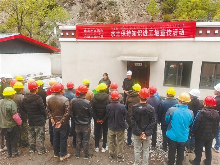 林芝市水利局工作人員在朗縣拉多鄉(xiāng)項(xiàng)目工地向一線工人和管理人員宣傳水土保持知識(shí)