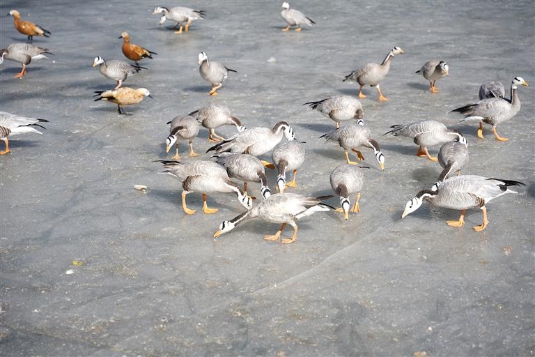 如果你想觀賞候鳥(niǎo),可以前往拉薩3號(hào)壩橋,清澈的水面上候鳥(niǎo)聚集成群。米瑪頓珠和老伴站立在橋面上,靜靜欣賞著候鳥(niǎo),時(shí)不時(shí)還有候鳥(niǎo)飛過(guò)他們的頭頂,在半空中盤(pán)旋一番,再落到水面。