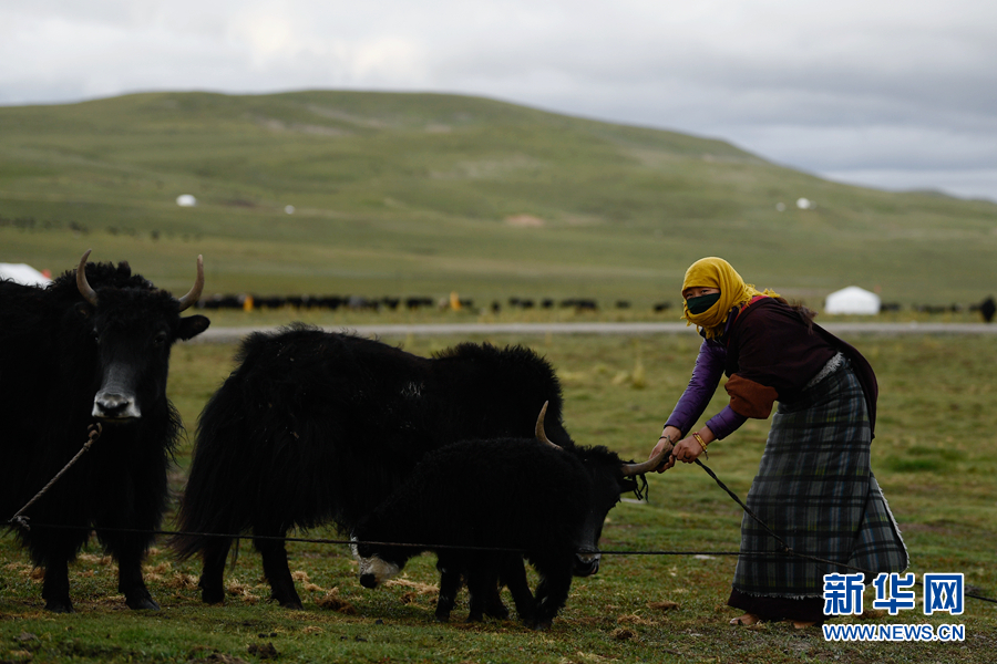 在果洛州瑪沁縣當(dāng)洛鄉(xiāng)貢龍村的夏季草場上,牧民在拴牦牛。(資料圖)新華社記者 張龍 攝