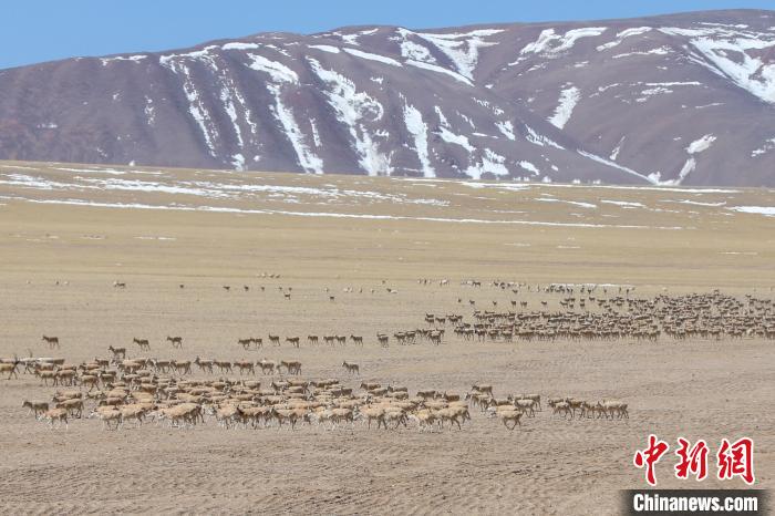 圖為3月27日,西藏阿里改則縣的藏羚羊群?!∵叞汀z