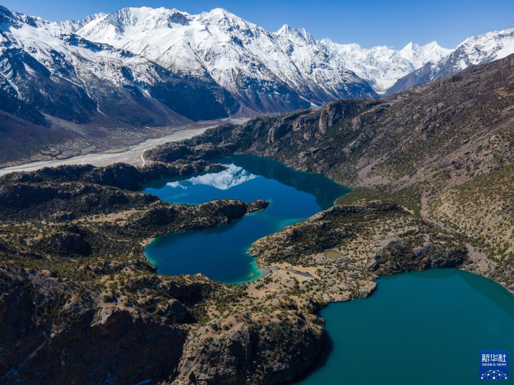 黑湖映射出雪山的倒影(4月2日攝,無(wú)人機(jī)照片)。新華社記者 周荻瀟 攝