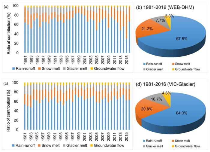 王磊表示,依托監(jiān)測網(wǎng)絡(luò)和其他多源數(shù)據(jù),研究團(tuán)隊生成了1981-2019年這38年內(nèi)雅魯藏布江流域高時空分辨率降水?dāng)?shù)據(jù),在此基礎(chǔ)上進(jìn)一步通過對比、綜合主流冰凍圈水文模型的徑流組分模擬,研究得出的結(jié)果顯示,雅魯藏布江流域(奴下水文站以上)新的降雨、融雪、冰川融化和地下水補給分別占總徑流的66%、21%、9%和4%。