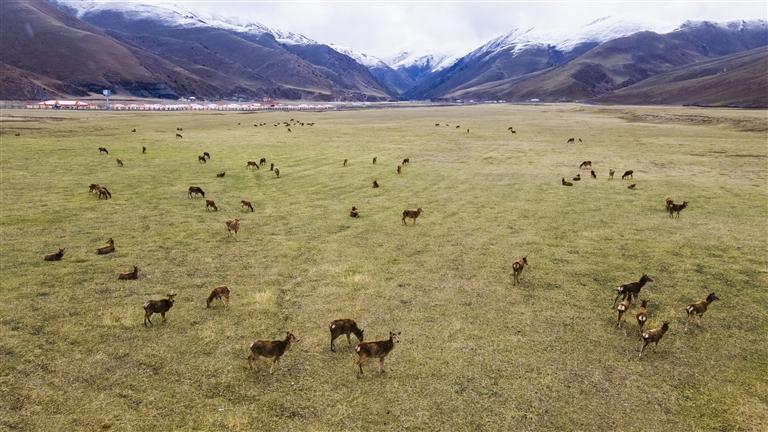5月21日在類烏齊馬鹿國家級(jí)自然保護(hù)區(qū)拍攝的馬鹿(無人機(jī)照片)。新華社記者 周荻瀟 攝