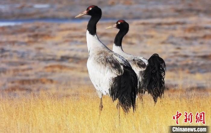 圖為黑頸鶴夫婦以高聲合鳴的方式宣誓領(lǐng)地,威懾入侵者。 張景元 攝