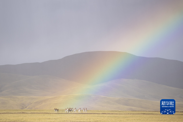 彩虹下的羌塘國(guó)家級(jí)自然保護(hù)區(qū)藏野驢。(新華社記者孫瑞博攝)