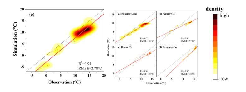 湖泊水溫是區(qū)域水分與能量平衡的重要變量,也是湖泊水生生態(tài)系統(tǒng)的控制性參數(shù)。由于常規(guī)地面觀測的局限,青藏高原湖泊水溫觀測數(shù)據普遍缺乏。團隊集成遙感與數(shù)值模擬技術,發(fā)展了水溫數(shù)據重建的技術框架,突破了模型數(shù)據要求高而移植性差的局限,實現(xiàn)了多相態(tài)(冰、水、冰水混合)下湖泊水溫的動態(tài)模擬,揭示了青藏高原湖泊水溫的時空演化規(guī)律及其對氣候變化的響應。