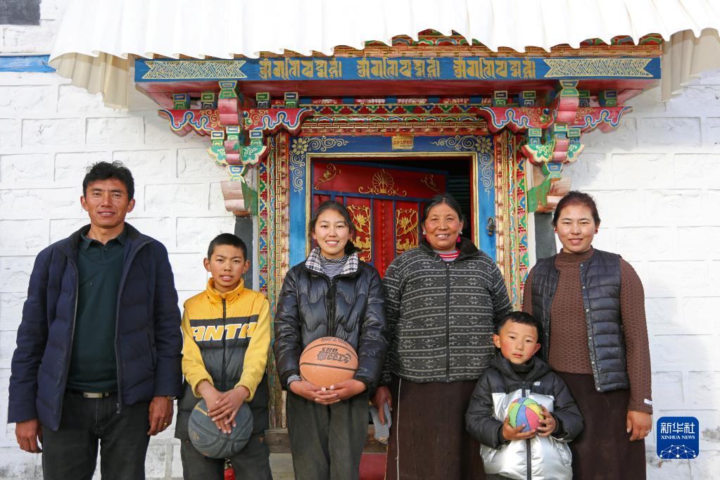 林芝市嘎拉村村民達(dá)瓦堅(jiān)參(左一)一家在家門(mén)口合影(2022年2月23日攝)。新華社記者 姜帆 攝