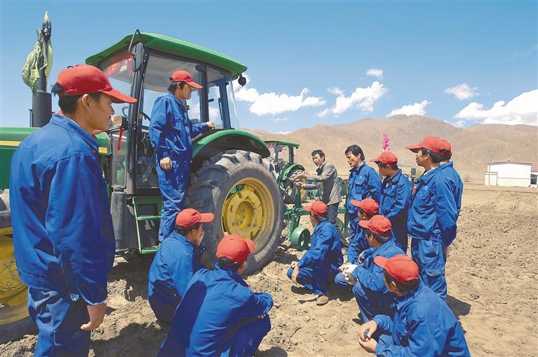 發(fā)展教育脫貧一批。2016年以來(lái),累計(jì)落實(shí)義務(wù)教育學(xué)?;窘ㄔO(shè)資金84.4億元,實(shí)施教育基礎(chǔ)建設(shè)項(xiàng)目1433個(gè),資助建檔立卡和農(nóng)村低保大學(xué)生累計(jì)6.06萬(wàn)人次,落實(shí)資助資金3.55億元。圖為西藏自治區(qū)白朗縣邀請(qǐng)山東農(nóng)機(jī)技師對(duì)當(dāng)?shù)刎毨糸_展培訓(xùn)。