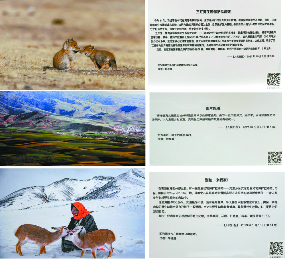 兩只憨態(tài)可掬的藏狐寶寶、卓爾山腳下的美麗鄉(xiāng)村、人與自然和諧共生的美好畫面……黨的二十大新聞中心融媒體體驗區(qū)互動展示墻上三張反映青海生態(tài)的照片,吸引了境內(nèi)外媒體記者的關(guān)注。 本報記者 祁國彪 魏慧敏 攝