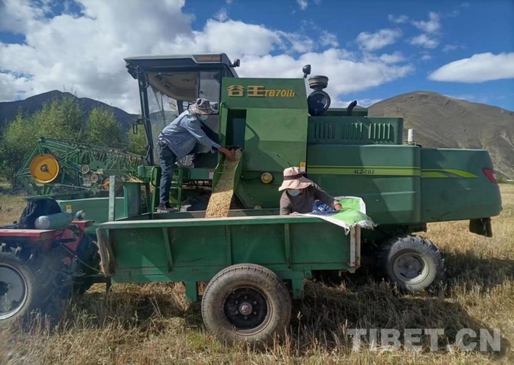 圖為國家牧草產(chǎn)業(yè)技術(shù)體系拉薩綜合試驗站曲尼帕基地燕麥種子秋收搶收工作(海拔3760米)