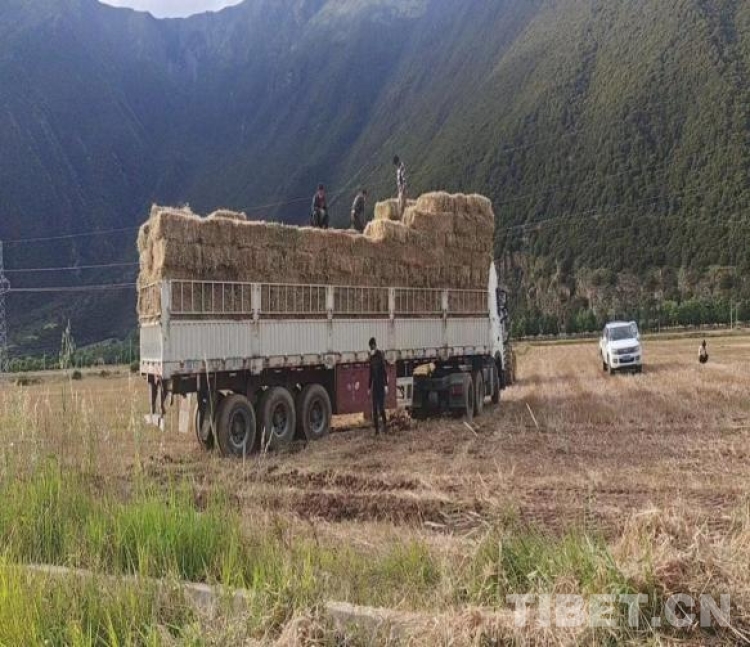 圖為國家牧草產(chǎn)業(yè)技術(shù)體系拉薩綜合試驗站工布江達縣示范點秋收搶收(海拔3990米)打捆裝車的牧草