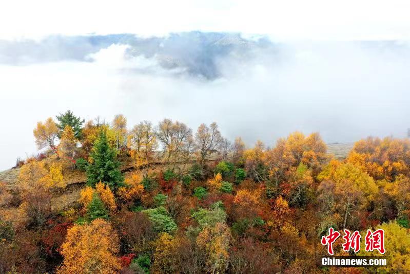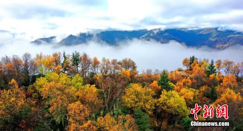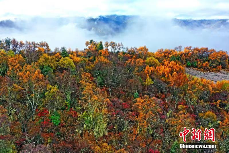 深秋時節(jié),四川馬爾康市馬爾康鎮(zhèn)阿底村賽馬山迎來彩林觀賞的最佳季節(jié)。放眼望去,海拔3500米的賽馬山上彩林連綿延伸至茫茫云海,遠(yuǎn)方雪山四面環(huán)繞,宛如仙境一般。阿壩州文體旅游局供圖