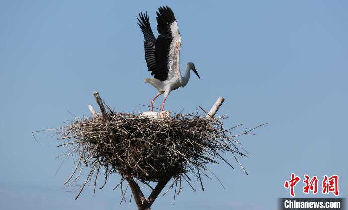 在人工巢內(nèi)的東方白鸛。 黑龍江洪河國家級自然保護(hù)區(qū)管理局提供