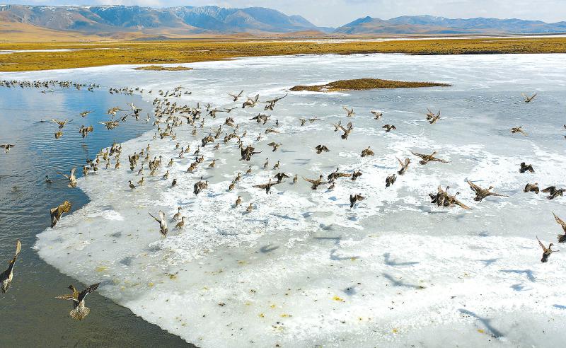 陽光下,數(shù)千只珍稀飛禽在光影交錯的若爾蓋花湖嬉戲翱翔。尹鋼 攝(資料圖片)