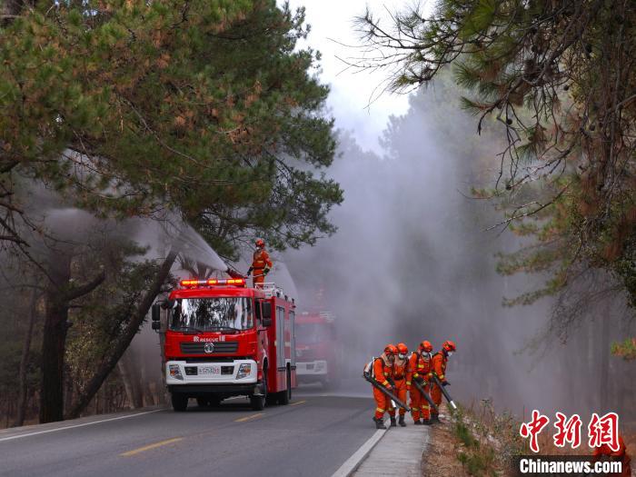 圖為森林消防員正在進行灑水增濕作業(yè)?!“鸵藚^(qū)森林消防中隊供圖