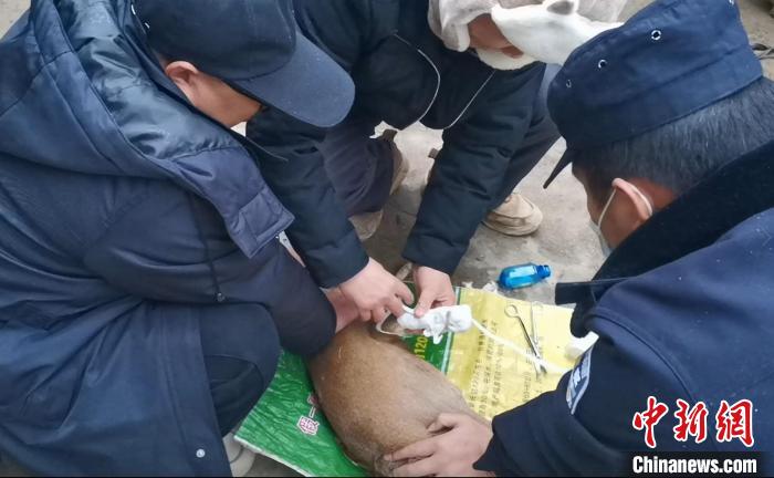 圖為移民管理警察與獸醫(yī)站人員為赤麂包扎傷口?!⌒?攝