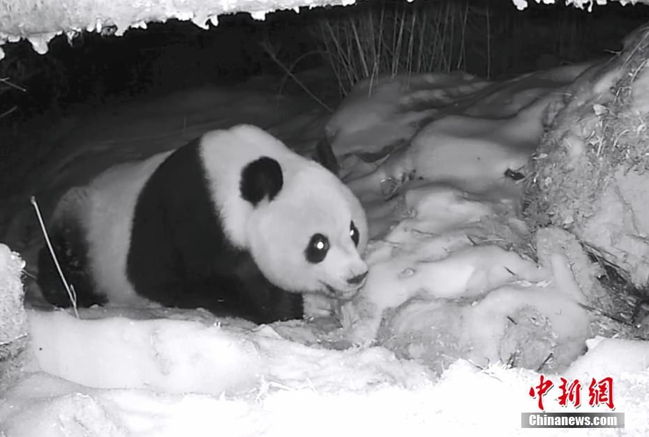 近日,大熊貓國家公園四川平武王朗片區(qū)工作人員在回收野外紅外線相機(jī)時(shí),發(fā)現(xiàn)幾段野生大熊貓?jiān)谘┑刂姓宜鹊恼滟F影像。圖為野生大熊貓?jiān)谘┑刂姓宜取?/p>
