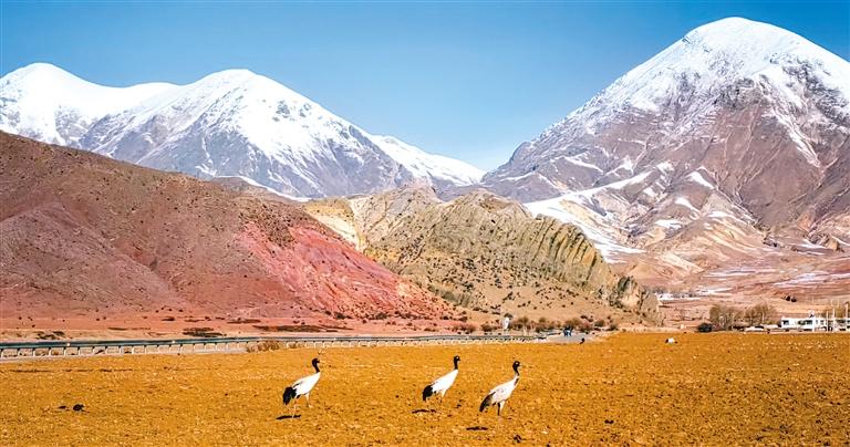 圖為在拉薩市林周縣,黑頸鶴在雪山腳下的農(nóng)田里覓食(3月1日攝)。新華社記者 沈虹冰 攝