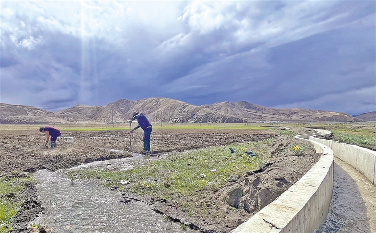 圖為浪卡子縣多卻鄉(xiāng)亞如村群眾正在從干渠引水灌溉農(nóng)田。記者 丹增平措 見習記者 武沛濤 攝
