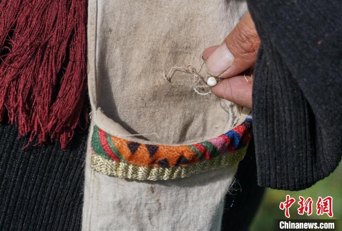 圖為青海省果洛州甘德縣藏族牧民將采挖到的野生貝母裝入特制藏式布袋中。 馬銘言 攝