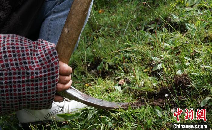 圖為青海省果洛州甘德縣藏族牧民利用鋤頭在山間采挖野生貝母。 馬銘言 攝