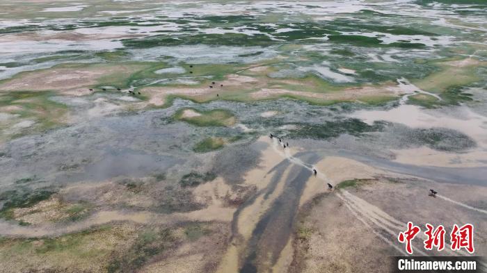 空中俯瞰阿爾金山國家級(jí)自然保護(hù)區(qū),芳草萋萋的依協(xié)克帕提濕地上,優(yōu)雅靈動(dòng)的黑頸鶴夫婦正在教授新出生的黑頸鶴寶寶學(xué)習(xí)捕食的技巧;鶴群的不遠(yuǎn)處,藏原羚一邊享受著多汁的青草,一邊好奇地打量著周圍的環(huán)境。
