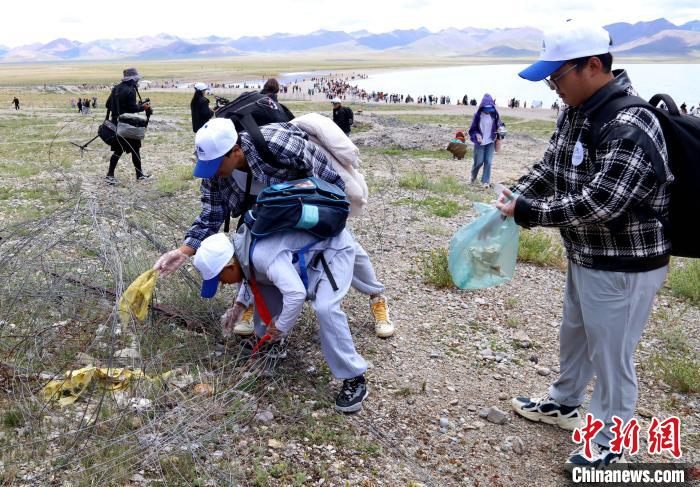 圖為青少年在納木錯(cuò)湖畔撿拾垃圾。拉薩市圖書館供圖