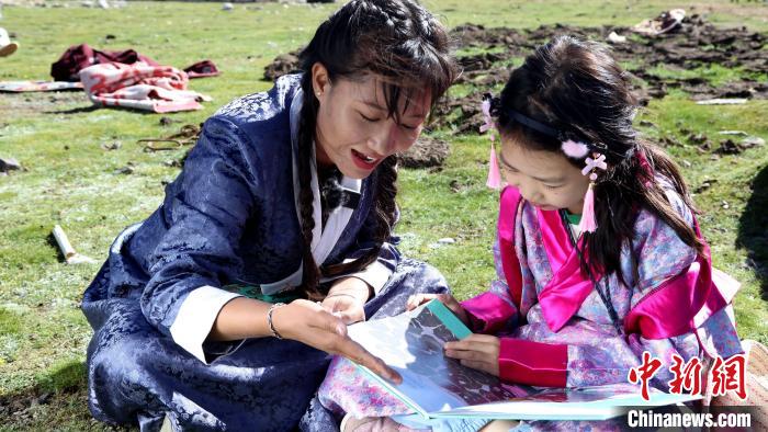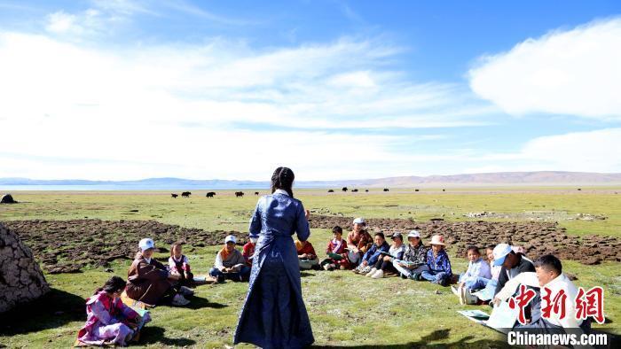 圖為青少年在納木錯(cuò)湖畔的牧區(qū)共同閱讀《牛糞們的愿望》。拉薩市圖書館供圖