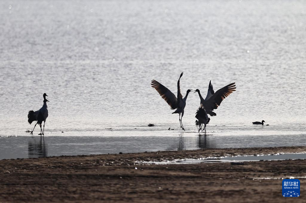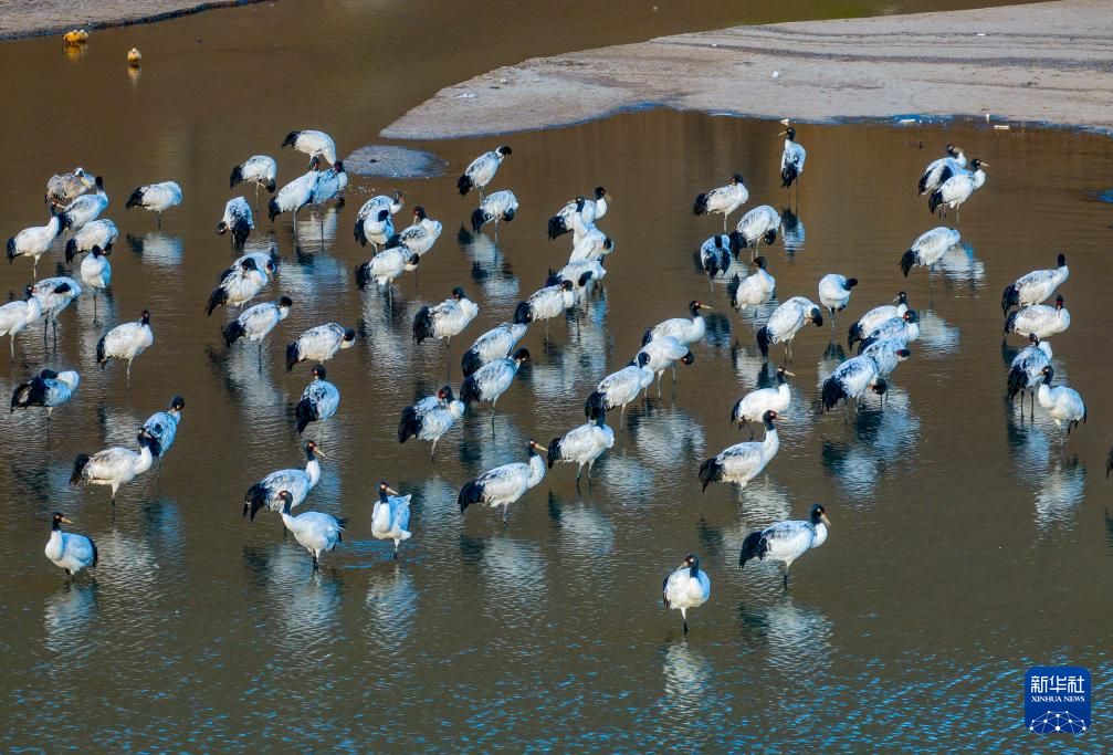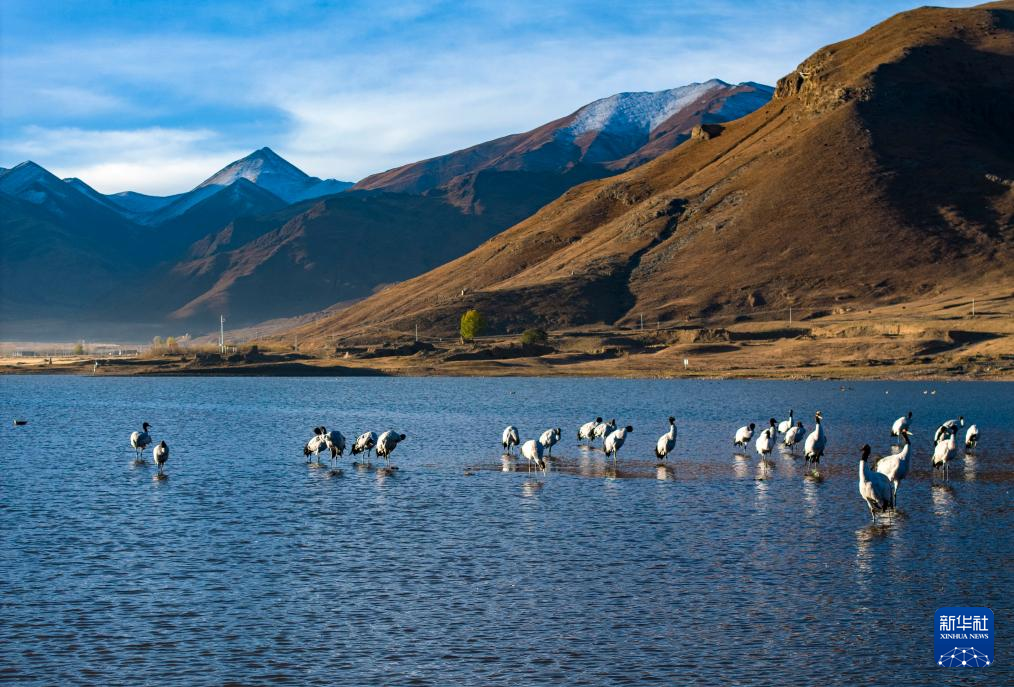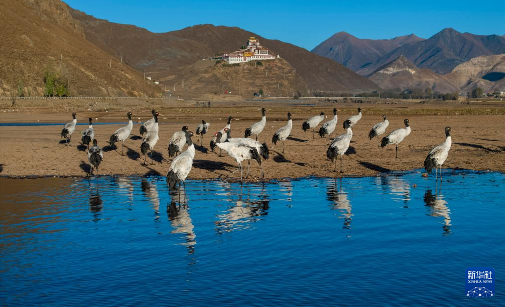 這是在拉薩市林周縣虎頭山水庫(kù)拍攝的越冬黑頸鶴(10月24日攝)。新華社記者 姜帆 攝