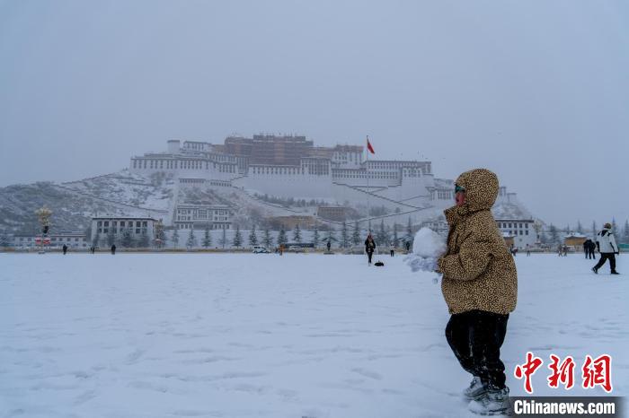 圖為1月18日,拉薩迎來(lái)2024年首場(chǎng)大雪,一位孩子在布達(dá)拉宮廣場(chǎng)玩雪。江飛波 攝