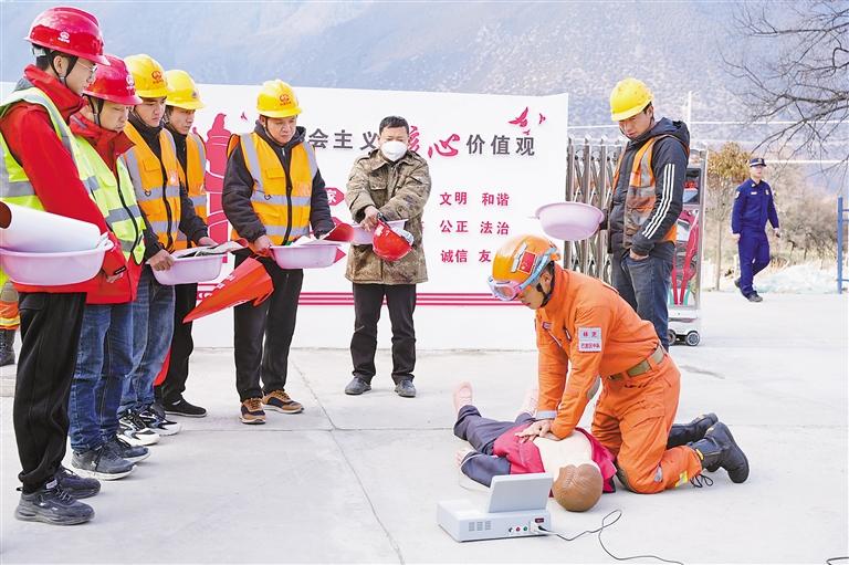 圖為林芝市森林消防支隊(duì)培訓(xùn)隊(duì)員為中鐵職工講解心肺復(fù)蘇知識(shí)。